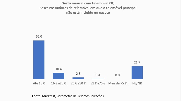 Entre os inquiridos neste Barómetro que não têm o telemóvel incluído na mesalidade do pacote, 65% afirmou não pagar mais de 15 euros mensais pela conta de telemóvel, 10.4% referiu que pagava entre 16 e 25 euros por estas contas e 2.9% apontou valores acima de 25 euros mensais. Houve 21.7% de inquiridos que não soube ou não quis responder a esta questão.